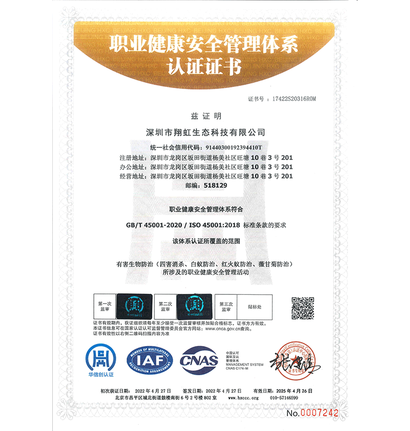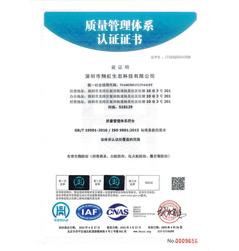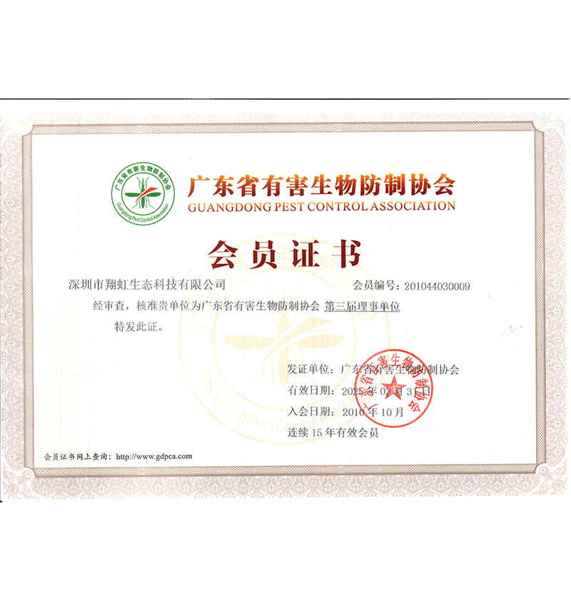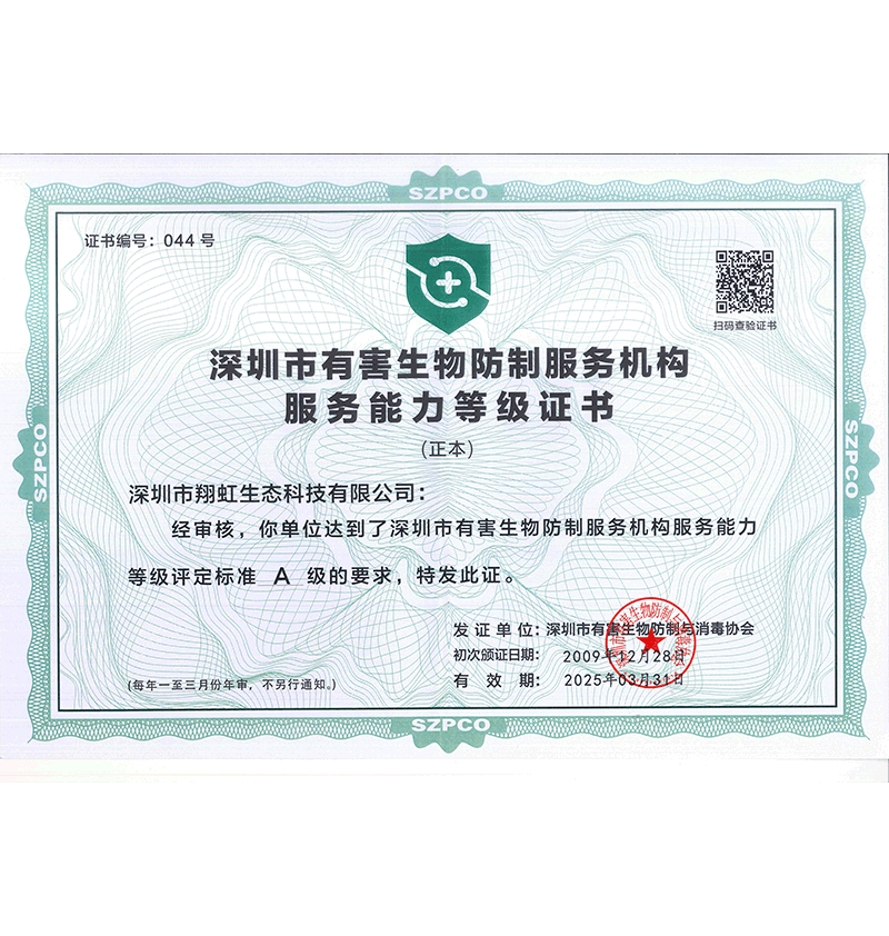 深圳市翔虹生態(tài)科技有限公司成立于1995年,是深圳最早成立的專業(yè)蟲害防治公司之一。公司發(fā)展至今獲得全國有害生物防制服務(wù)A級(jí)資質(zhì)、廣東省有害生物防制服務(wù)A級(jí)資質(zhì)、深圳市有害生物防制服務(wù)A級(jí)資質(zhì)、廣東省有害生物防制服務(wù)A級(jí)資質(zhì)、深圳市有害生物防制服務(wù)甲級(jí)資質(zhì)的單位,是中國有害生物防治協(xié)會(huì)會(huì)員、廣東省有害生物防治協(xié)會(huì)會(huì)員、深圳市有害生物防治協(xié)會(huì)理事單位,多次獲得“深圳市十佳消殺單位”榮譽(yù)。